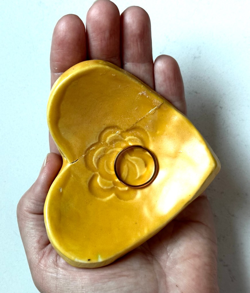 I was browsing in a gift shop when the message came to me. A tiny ring plate in the shape of a heart had caught my eye. I’m not sure why. Being newly widowed, I had decided to put my wedding ring away for safekeeping. Before I could stop it, the thing slipped out of my hand and went flying across the floor and cracked in two. Embarrassed and feeling the eyes of others on me, I tried to discreetly pick up the pieces. “Just your local widow here, clumsy and not thinking straight.” I thought. I took the piece to the salesclerk to let them know it had broken. They whispered “It’s OK. Happens all the time… Would you like to purchase this?”